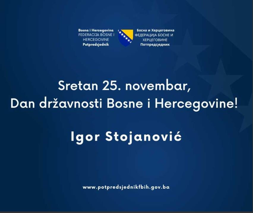 Povodom obilježavanja 25. novembra – Dana državnosti Bosne i Hercegovine, potpredsjednik Federacije Bosne i Hercegovine, Igor Stojanović, uputio je čestitku svim građankama i građanima: