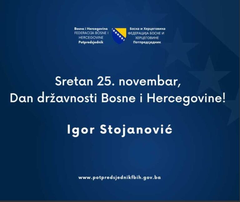 Povodom obilježavanja 25. novembra – Dana državnosti Bosne i Hercegovine, potpredsjednik Federacije Bosne i Hercegovine, Igor Stojanović, uputio je čestitku svim građankama…